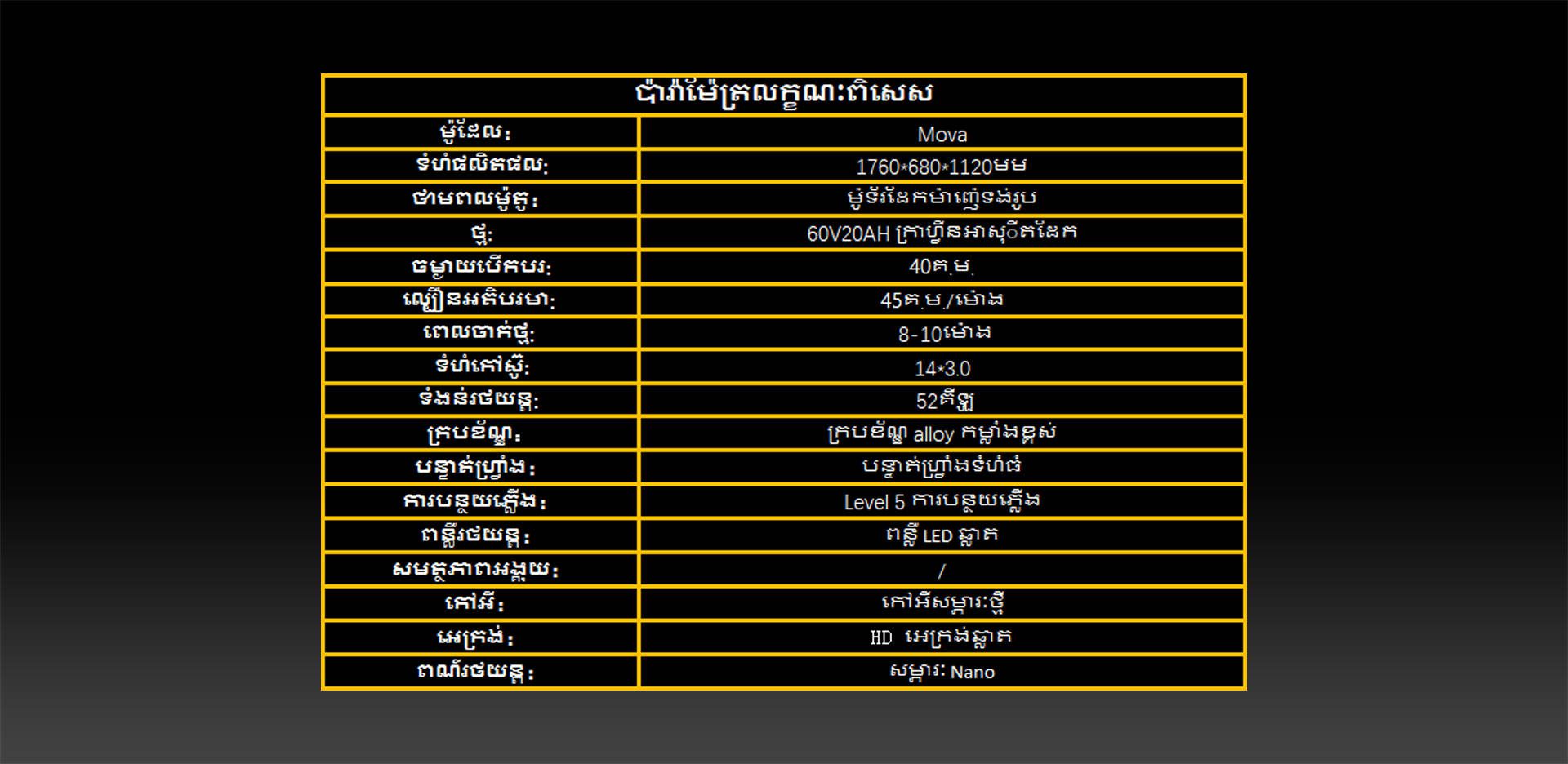 ប៉ារ៉ាម៉ែត្រថ្ម៖ 60V20AH ថ្មអាស៊ីតខ្យល់ថ្មពណ៌ប្រផេះ (Graphene Lead-Acid) ចម្ងាយដំណើរបាន៖ ៤០គ.ម ល្បឿនអតិបរមា៖ ៤៥គ.ម/ម៉ោង លក្ខណៈបច្ចេកទេស៖ ម៉ូទ័រស្ពានីដៃស្ពានីដៃដែកម៉ាញ៉េទិច ពេលវេលាសាកថ្ម៖ ៨-១០ម៉ោង ទំហំសំបកកង់៖ 14×3.0 ទំហំផលិតផល៖ 1760×680×1120ម.ម ទម្ងន់យានយន្ត៖ ៥២គ.ក