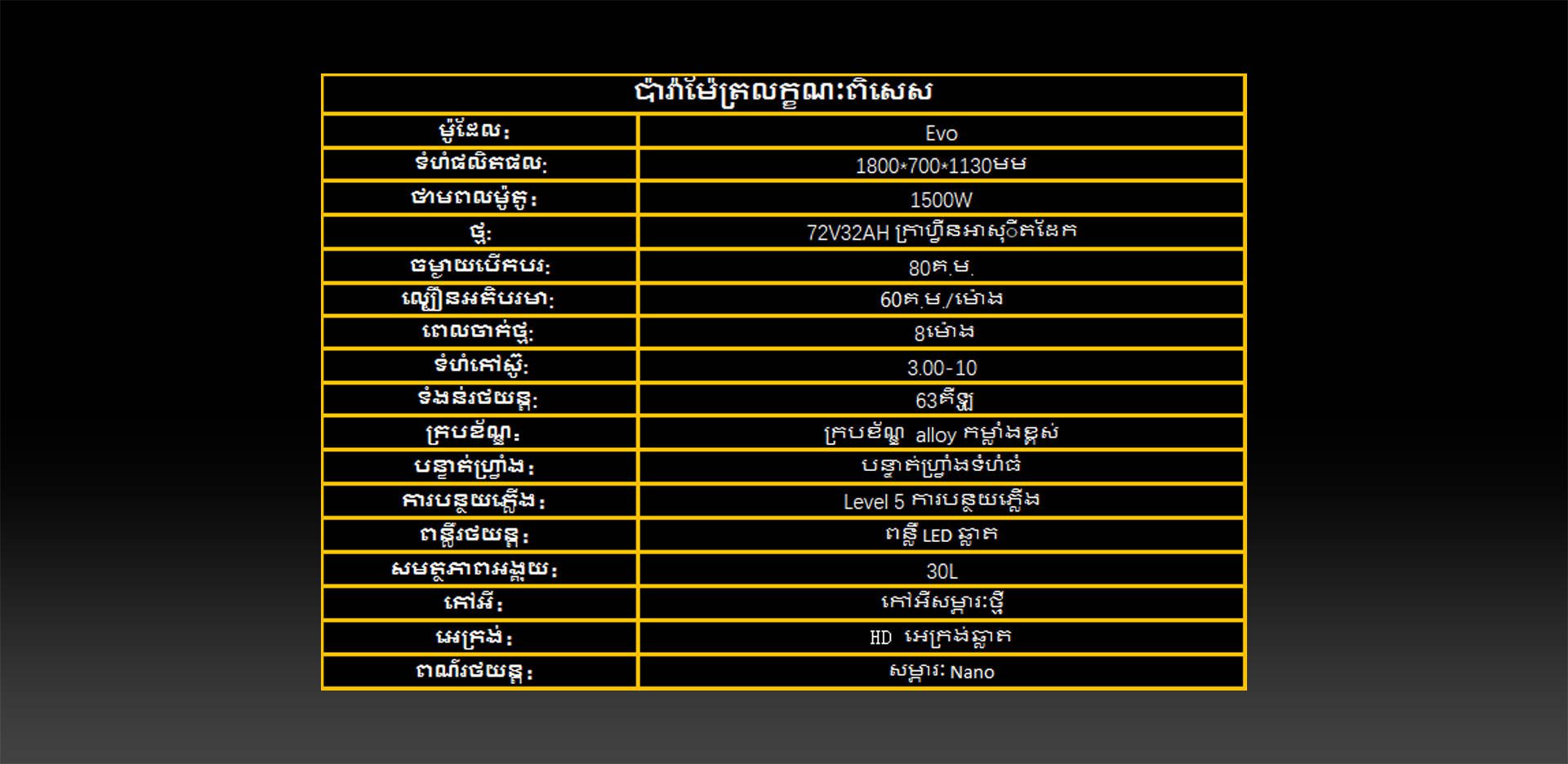 ប៉ារ៉ាម៉ែត្រថ្ម៖ 72V32AH ថ្មអាស៊ីតខ្យល់ថ្មពណ៌ប្រផេះ ចម្ងាយដំណើរក្រោមប្រេង៖ ៨០គ.ម ល្បឿនអតិបរមា៖ ៦០គ.ម/ម៉ោង បច្ចេកទេស៖ ម៉ូទ័រ 1500W ពេលសាកថ្ម៖ ៨ម៉ោង សំបកកង់៖ 3.00-10 វិមាត្រផលិតផល៖ 1800×700×1130ម.ម ម៉ាស់យានយន្ត៖ ៦៣គ.ក