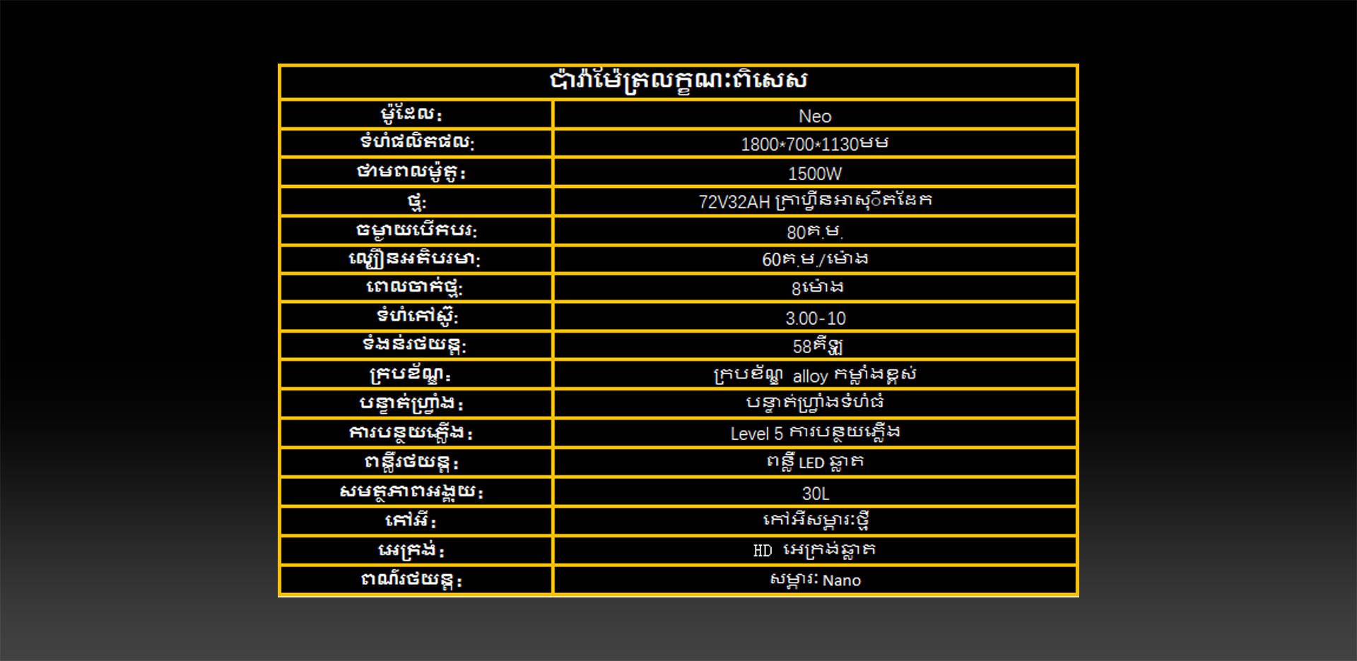 ប៉ារ៉ាម៉ែត្រថ្ម៖ 72V32AH ថ្មអាស៊ីតខ្យល់ថ្មពណ៌ប្រផេះ ចម្ងាយដំណើរបាន៖ ៨០គ.ម ល្បឿនអតិបរមា៖ ៦០គ.ម/ម៉ោង លក្ខណៈបច្ចេកទេស៖ ថាមពលម៉ូទ័រ 1500W ពេលវេលាសាកថ្ម៖ ៨ម៉ោង ទំហំសំបកកង់៖ 3.00-10 ទំហំផលិតផល៖ 1800×700×1130ម.ម ទម្ងន់យានយន្ត៖ ៥៨គ.ក